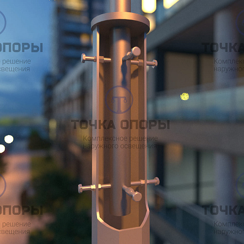 Силовая прямостоечная граненая опора имеет ребра жесткости, совпадающие с гранями опор, которые увеличивают устойчивость и надежность конструкции. Установка светового оборудования опор производится с помощью кронштейнов.